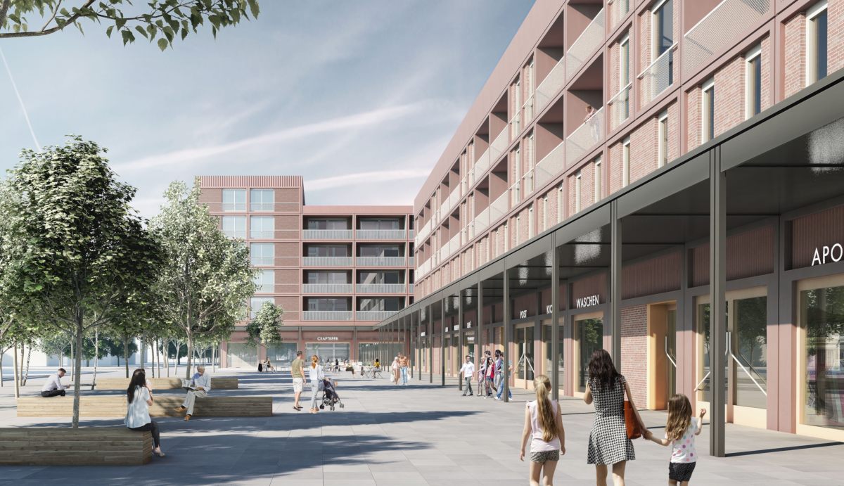 Zwei kräftige Blockrandsetzungen ordnen und definieren das Quartierszentrum am Berliner Platz. Es entsteht ein einsehbarer und präsenter Stadtraum. Die Wohnnutzung organisiert sich auf einem gewerblichen Sockel und hält hier, im Kontrast zum städtischen Berliner Platz, ruhige Wohnhöfe vor.