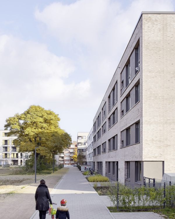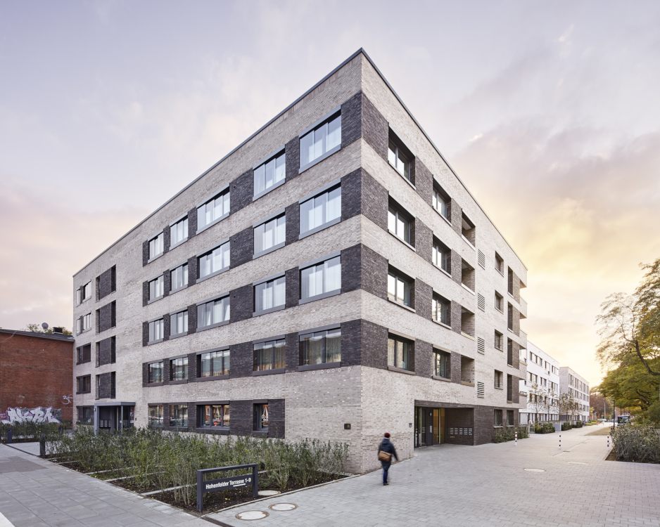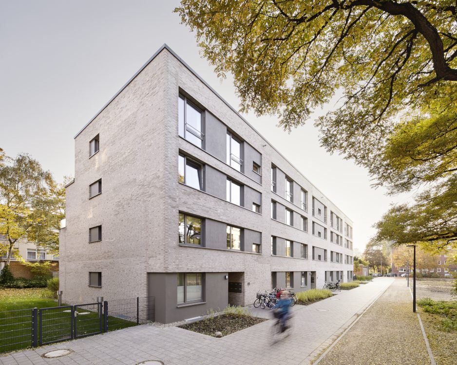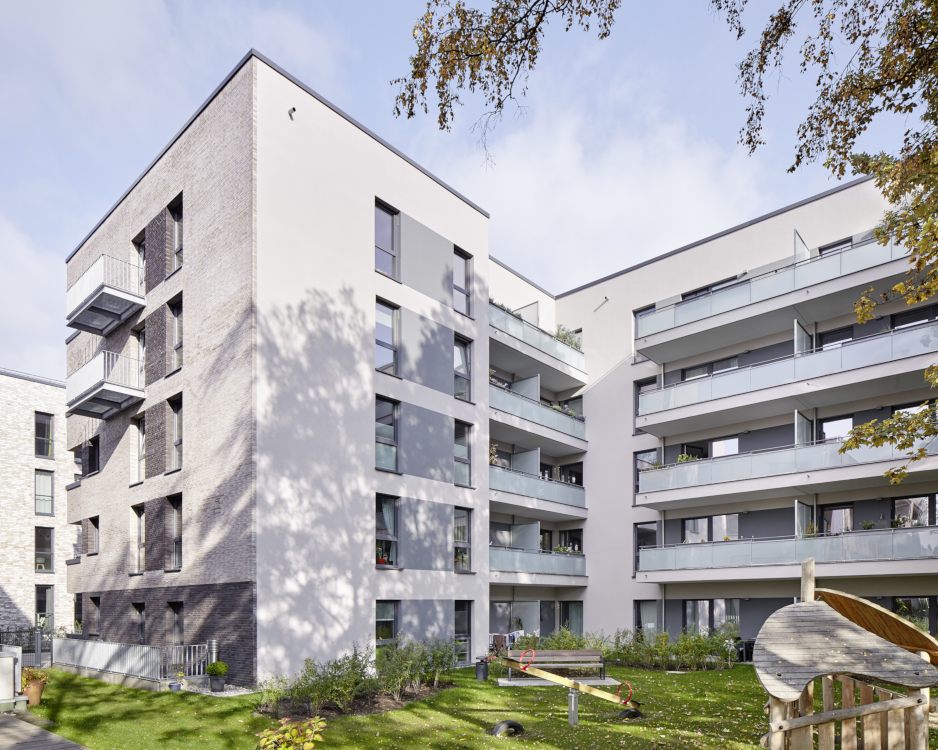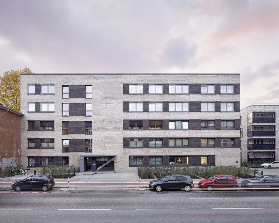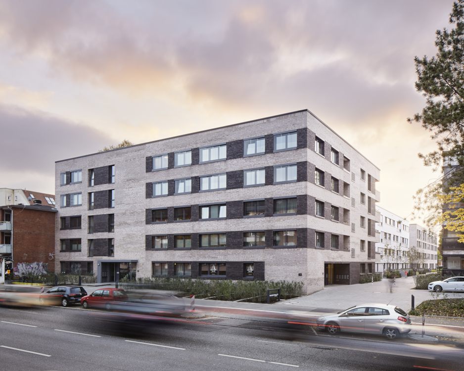 Das Projekt „Parkquartier Hohenfelde“ entstand auf dem Grundstück einer ehemaligen Schule und umfasst insgesamt 180 neue Wohnungen sowie eine neue öffentliche Parkanlage. Unser städtebaulicher Entwurf überzeugte die Jury durch eine Struktur, die allen Wohnungen einen klaren Bezug zum Park bietet, das Areal zum verkehrsreichen Mühlendamm hin schließt und vorhandene Gebäude sowie den wertvollen Baumbestand sinnvoll integriert. Nach dem Wettbewerbsgewinn und dem von uns begleiteten Bebauungsplan-Verfahren haben wir 2016 für die HANSA Baugenossenschaft 2 Gebäude mit 61 Wohneinheiten fertig gestellt. Zur Straße bzw. zum Park orientierte Fassaden wurden ruhig und großmaßstäblich gegliedert und mit hellem Klinker verblendet, während die Gartenseiten einen „luftigeren“ und informelleren Charakter bekamen.
