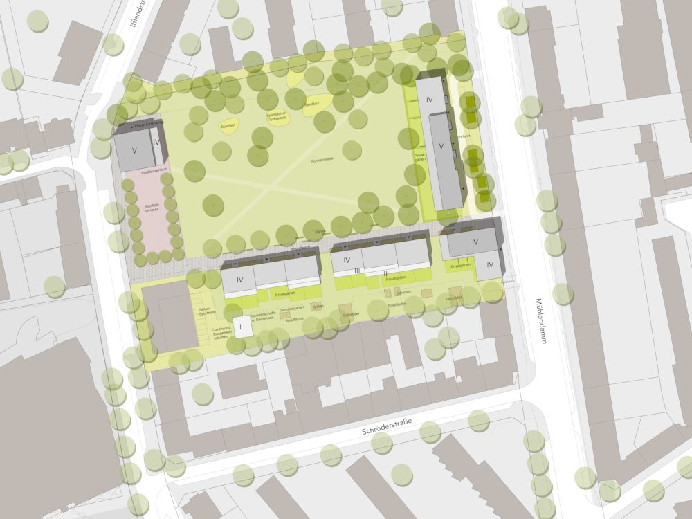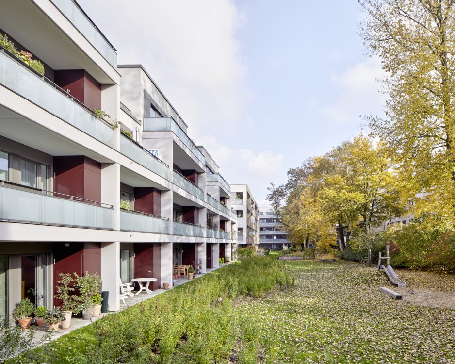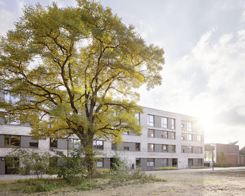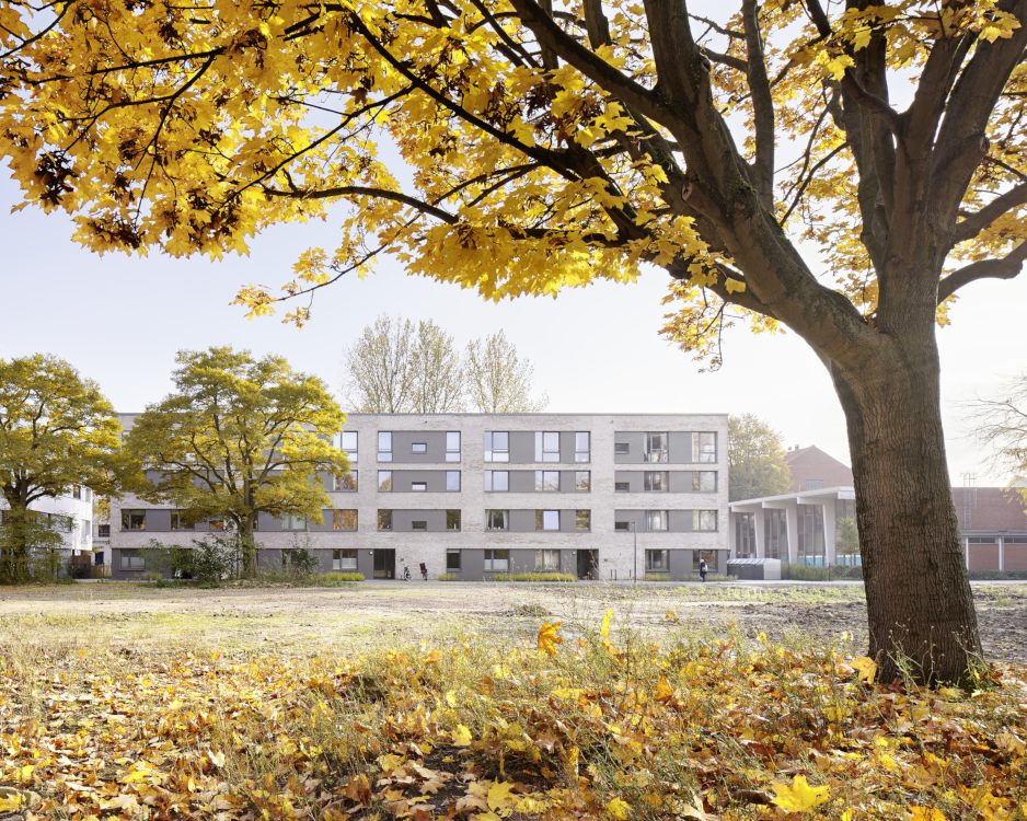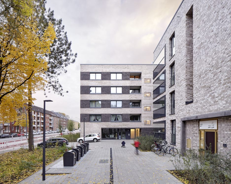 Das Projekt „Parkquartier Hohenfelde“ entstand auf dem Grundstück einer ehemaligen Schule und umfasst insgesamt 180 neue Wohnungen sowie eine neue öffentliche Parkanlage. Unser städtebaulicher Entwurf überzeugte die Jury durch eine Struktur, die allen Wohnungen einen klaren Bezug zum Park bietet, das Areal zum verkehrsreichen Mühlendamm hin schließt und vorhandene Gebäude sowie den wertvollen Baumbestand sinnvoll integriert. Nach dem Wettbewerbsgewinn und dem von uns begleiteten Bebauungsplan-Verfahren haben wir 2016 für die HANSA Baugenossenschaft 2 Gebäude mit 61 Wohneinheiten fertig gestellt. Zur Straße bzw. zum Park orientierte Fassaden wurden ruhig und großmaßstäblich gegliedert und mit hellem Klinker verblendet, während die Gartenseiten einen „luftigeren“ und informelleren Charakter bekamen.