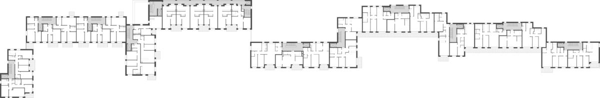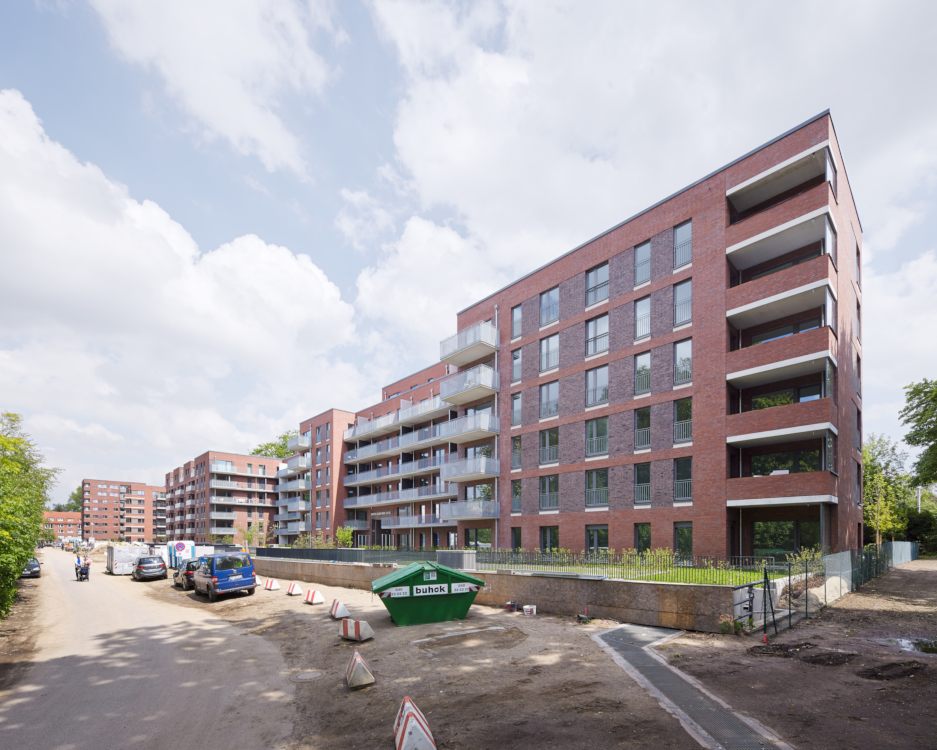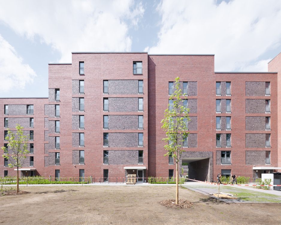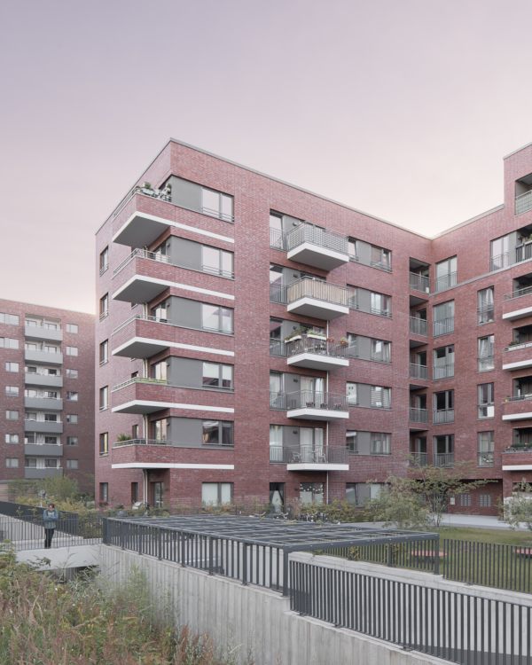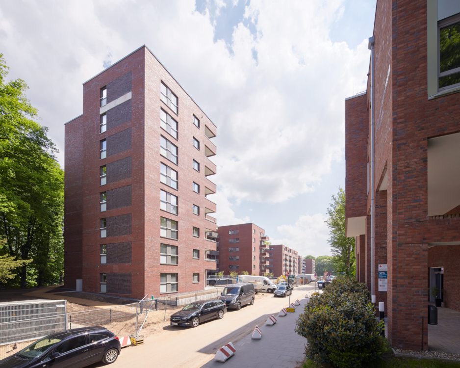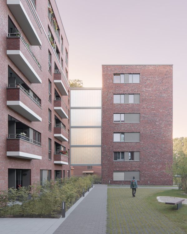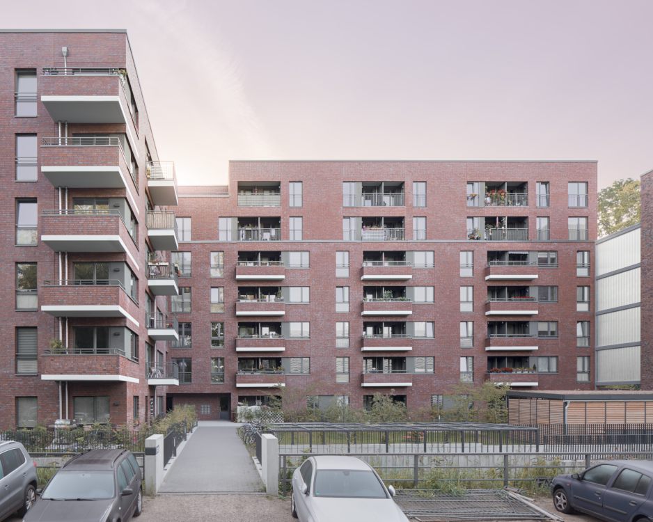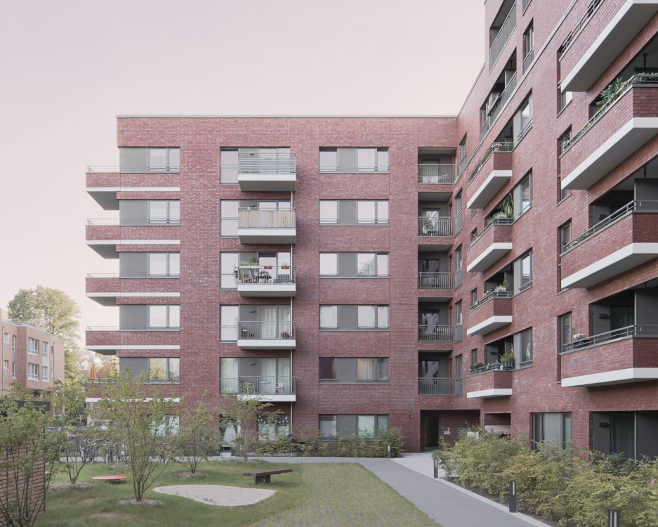 Aus einem von der Behrendt Gruppe, der SAGA, der Baugenossenschaft Fluwog sowie einer privaten Baugruppe ausgelobten Gutachterverfahren ging coido 2015 als Sieger hervor. Der inzwischen umgesetzte Entwurf sieht eine 250 Meter lange Gebäudekette mit insgesamt 207 Wohnungen vor, die einerseits als durchgehende Struktur gegen die Lärmbeeinträchtigungen der Bahn wirkt und andererseits geschützte, nach Westen orientierte Höfe bildet. An diesen Hofseiten sind die Fassaden fein detailliert und auf langsames Betrachten ausgerichtet. Die notwendigerweise geschlossenere Ostseite hingegen wird durch großmaßstäbliche Themen gegliedert, um auch aus der vorbeifahrenden Bahn heraus ein prägnantes und abwechslungsreiches Bild zu bieten.