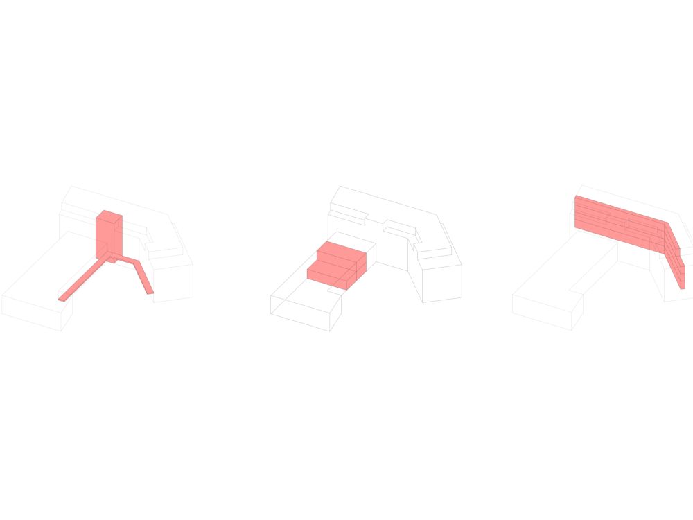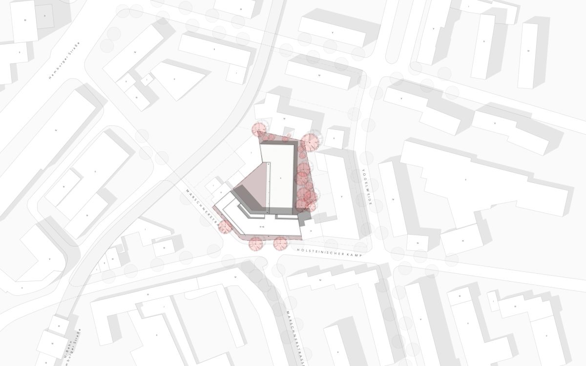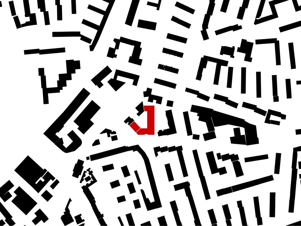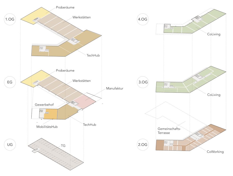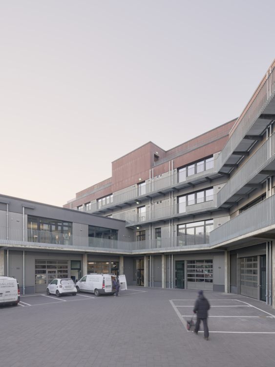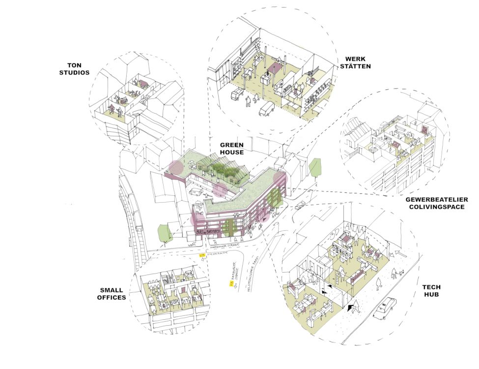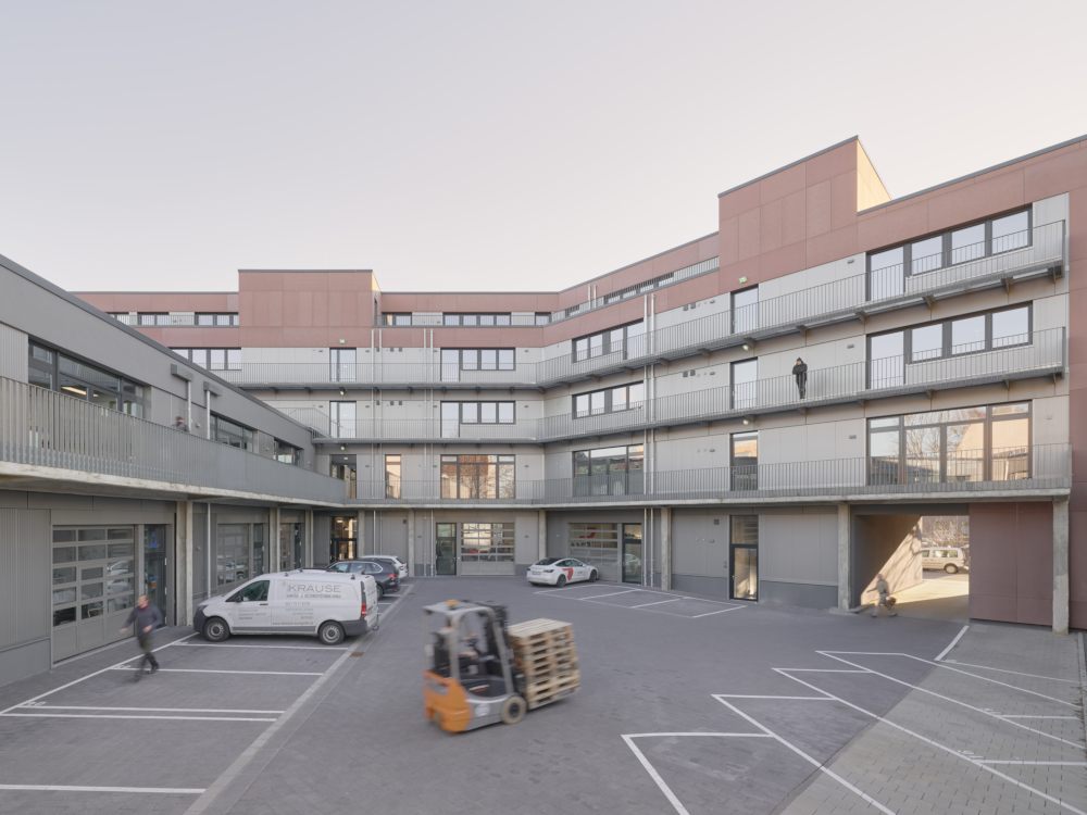 In der städtebaulichen Figur des 5.300 qm großen Komplexes spiegelt sich hohe Nutzungsvielfalt: Während der straßenbegleitende Baukörper die Höhe der Nachbarbebauung aufgreift, klassische Stadtreparatur betreibt und großflächige Nutzungen aufnehmen kann, steht der zweigeschossige Flügel im Blockinneren für kleinteiligere Werkstätten zur Verfügung. Letztere sind durch die direkte Verbindung zum gemeinsam genutzten Hof, der auch der Anlieferung dient, besonders attraktiv.