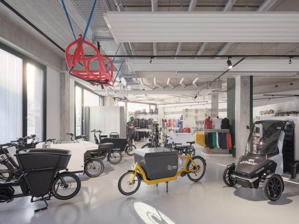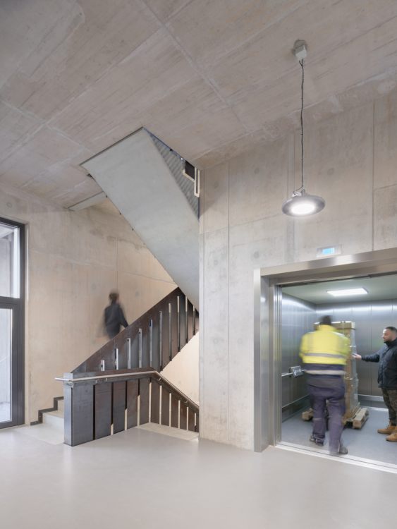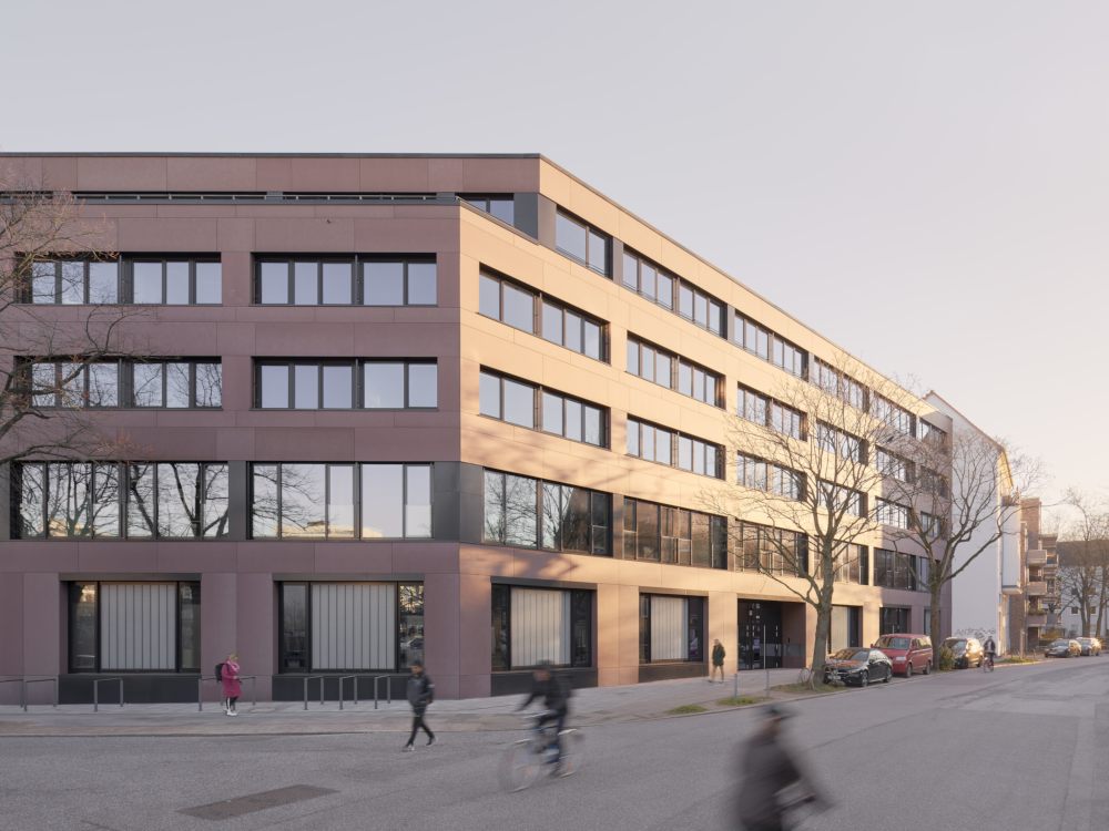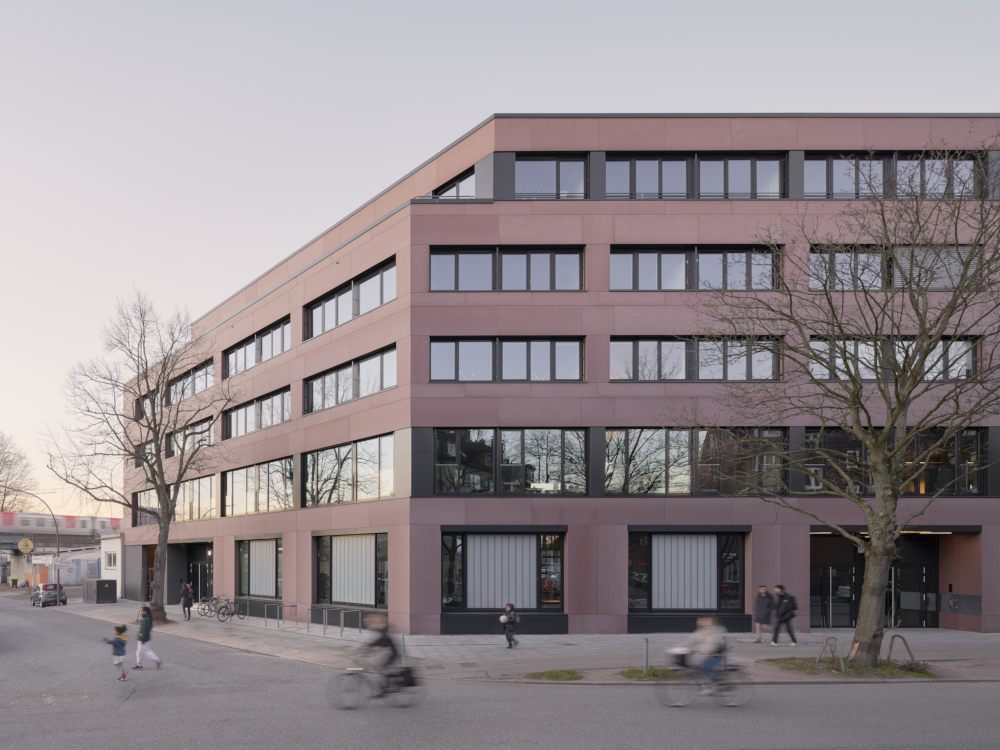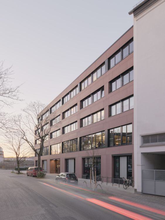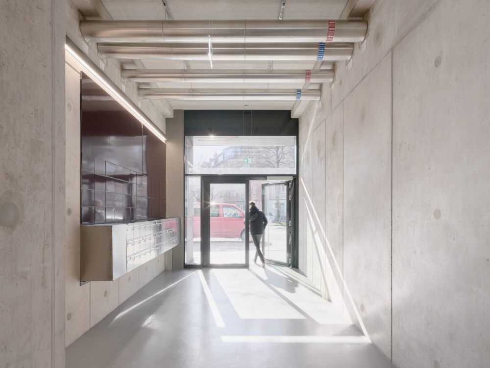 Das Gebäude basiert auf einem klaren Raster und wurde als vorgefertigter Industriebau konzipiert. Auch die Fassaden erhalten einen robusten, gewerblich-industriellen Charakter, wobei die Straßenseite hochwertiger und etwas repräsentativer gestaltet ist. Mit rötlich eingefärbten, zementgebundenen Tafeln fügt sie sich in den Kontext der von Backstein geprägten Nachbarschaft ein.