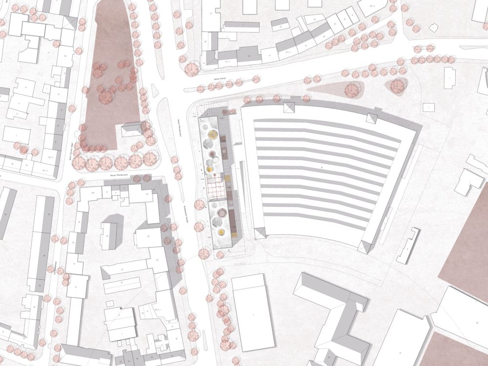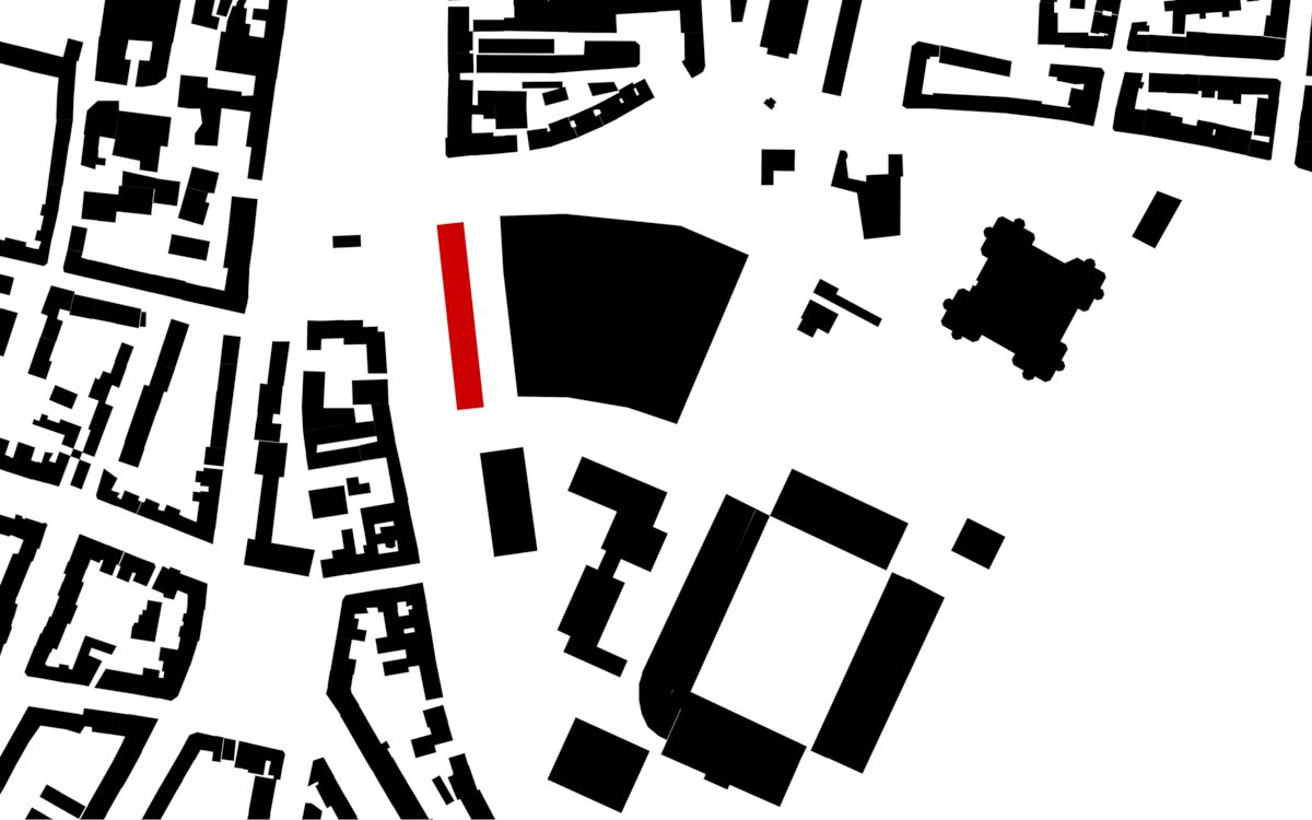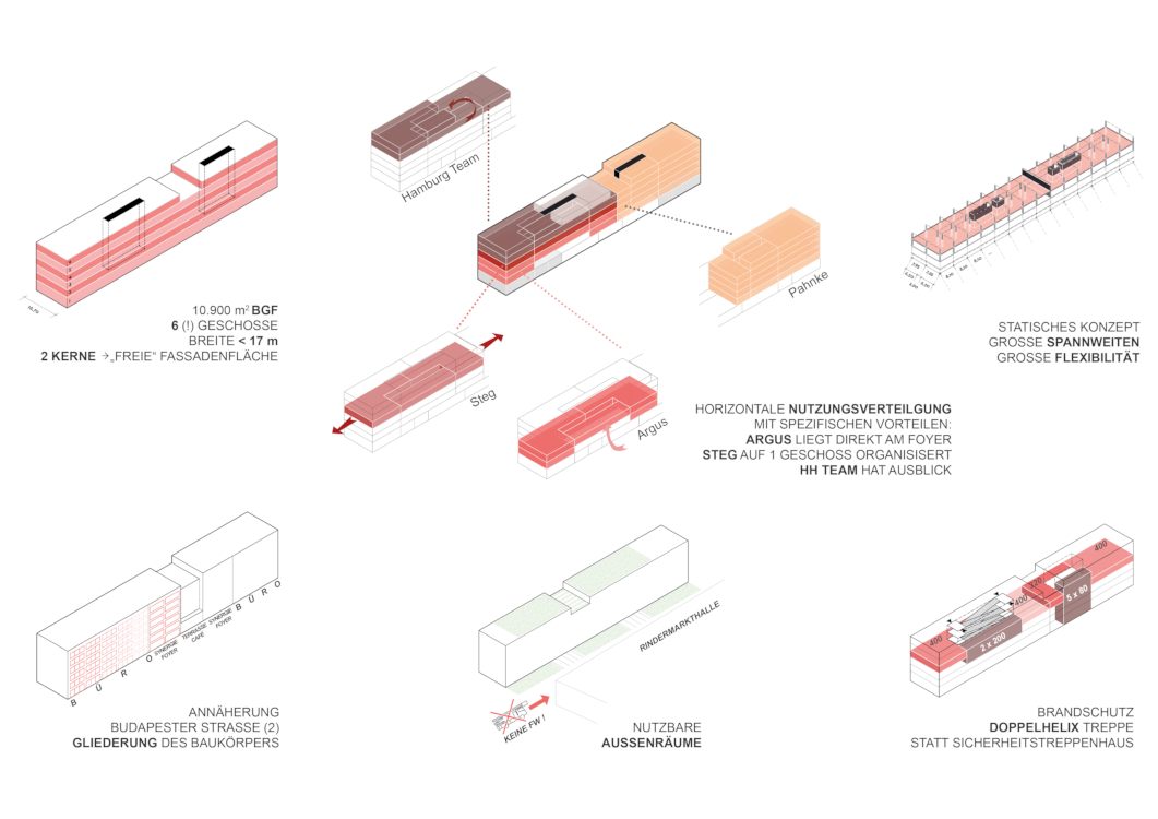 Städtebaulich fasst der Bau die weiträumige Kreuzungssituation und bildet den Abschluss des Rindermarktareals. An der Kreuzung springt das Gebäude leicht zurück, um so den vom Denkmalschutz geforderten Blick auf die alte Markthalle freizulassen. Die architektonische Idee ist ein robustes Arbeitshaus für viele Nutzer, das dem Stadtteil offen zugewandt ist und sich harmonisch in die Geschichte des Ortes einfügt. Das Fassadenkonzept ist vom New Yorker Meatpacking District ebenso inspiriert wie von der gegenüberliegenden Bebauung und fügt sich mit dem für St. Pauli typischen Selbstbewusstsein in seine Umgebung ein.