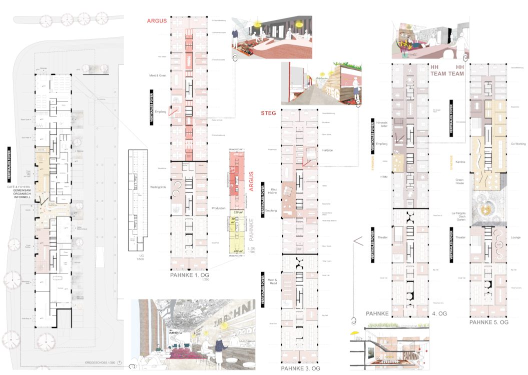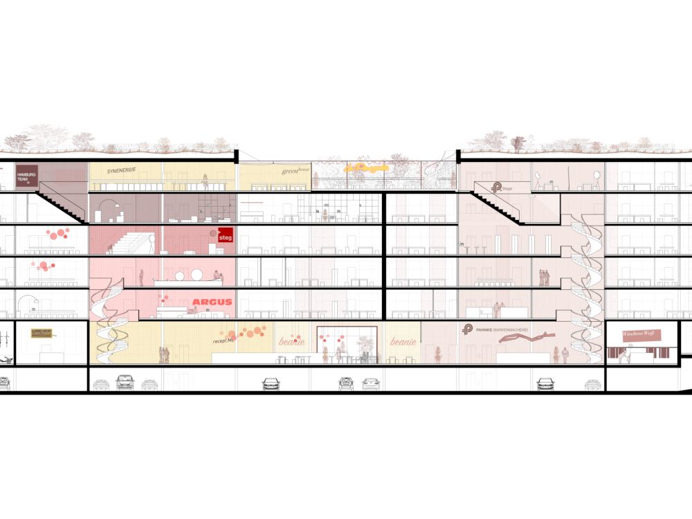 Während die Räume für die vier Hauptnutzer in den oberen Etagen untergebracht sind, entstand im Erdgeschoss ein Mix kleinerer Ladengeschäfte, Werkstätten und Manufakturen. Eine Besonderheit des gewerblichen Baugemeinschaftprojektes ist es, dass die Nutzungen nicht einfach etagenweise verteilt werden, sondern durch einen so genannten „Loop“ verbunden sind: Café und Empfangsbereiche im Erdgeschoss, vertikale Foyers in den Obergeschossen sowie Synergieflächen, die im gemeinsam genutzten Mitarbeiterrestaurant und der Dachterrasse münden, verbinden sich zu einem räumlichen Kontinuum.