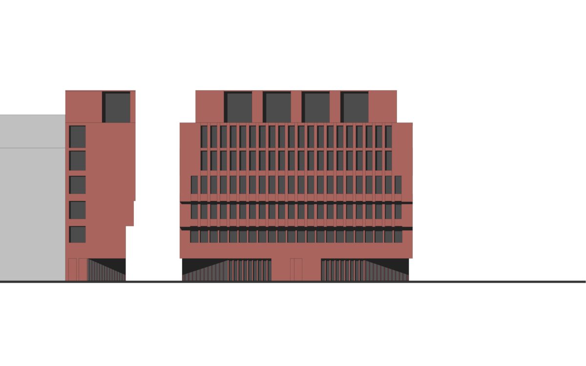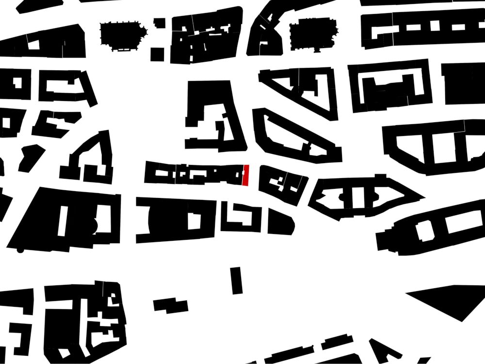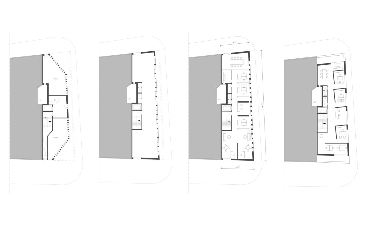 Für das Kopfgrundstück entwickeln wir ein solitärhaftes, selbstbewusstes Gebäude mit 3 Fassaden, die durch ihre Tiefenstaffelung und die vertikale Gliederung einen deutlich expressiven Charakter erhalten. Das schmale Grundstück legt dazu einen offenen, atelierhaften Grundriss nahe, der eine geschossweise Vermietung ermöglicht.