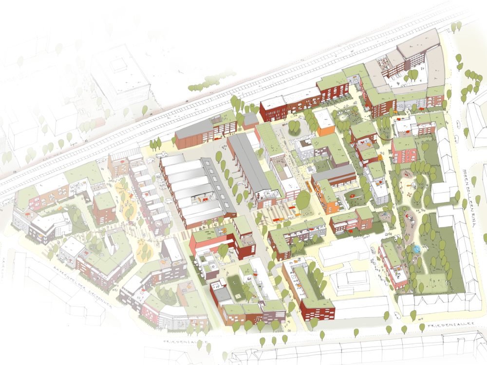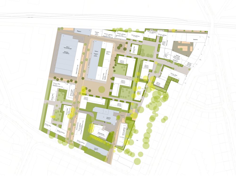 Grundsätzlich wird eine Blockrandstruktur gewählt, die aber durch gezielte Durchlässigkeit Raum für nachbarschaftliches Zusammenkommen lässt. Sowohl die Gebäudetypologie als auch der Umgang mit den Altbauten folgen dem Leitbild der „Ottenser Mischung“: So wurde eine der großen Bestandshallen kostengünstig instandgesetzt, um am Standort ansässige Gewerbetreibende durch günstige Mieten halten zu können, während die zentrale „Halle 6“ hochwertig saniert und mit Büro- und Gastronomieflächen ausgebaut wird.