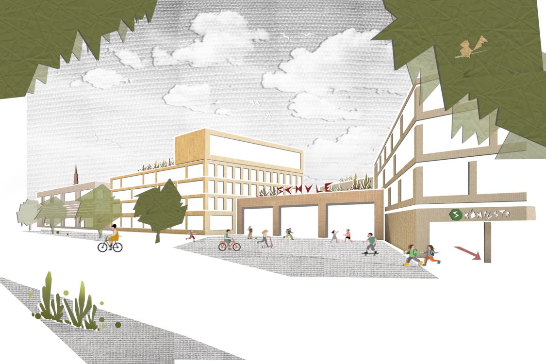Einbindung & Adressierung: Um die S-Bahn-Station Königstrasse entsteht ein angenehm proportionierter Stadtplatz, an dem sich prägnant adressiert die Eingänge zu den drei Schulbauten befinden. Die öffentlichkeitswirksamen, stadtteilbezogenen Funktionen der Schulen sind von hier aus über die Foyers direkt zu erreichen.