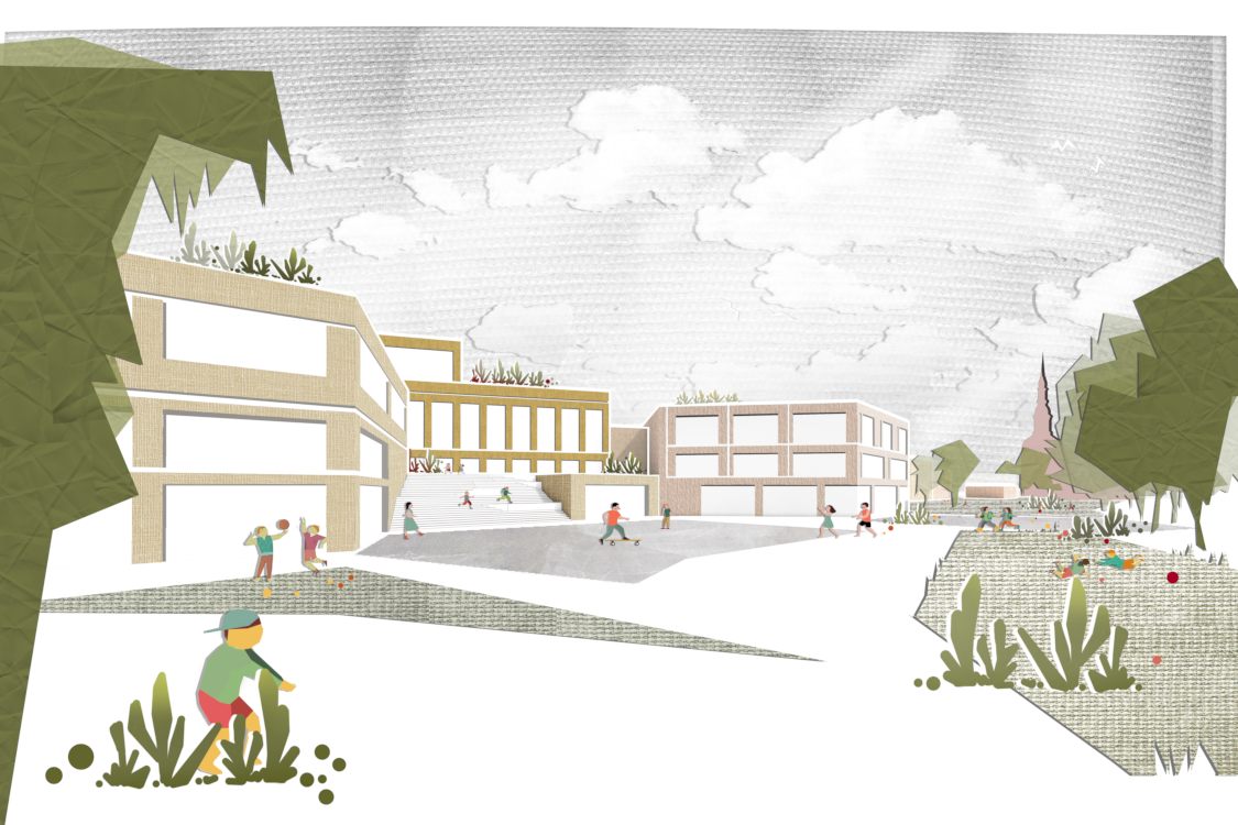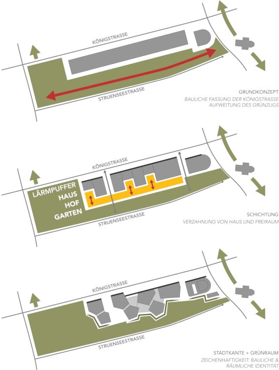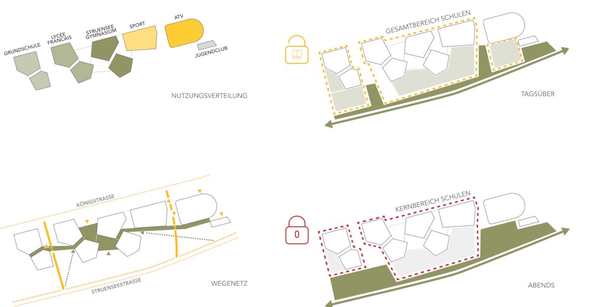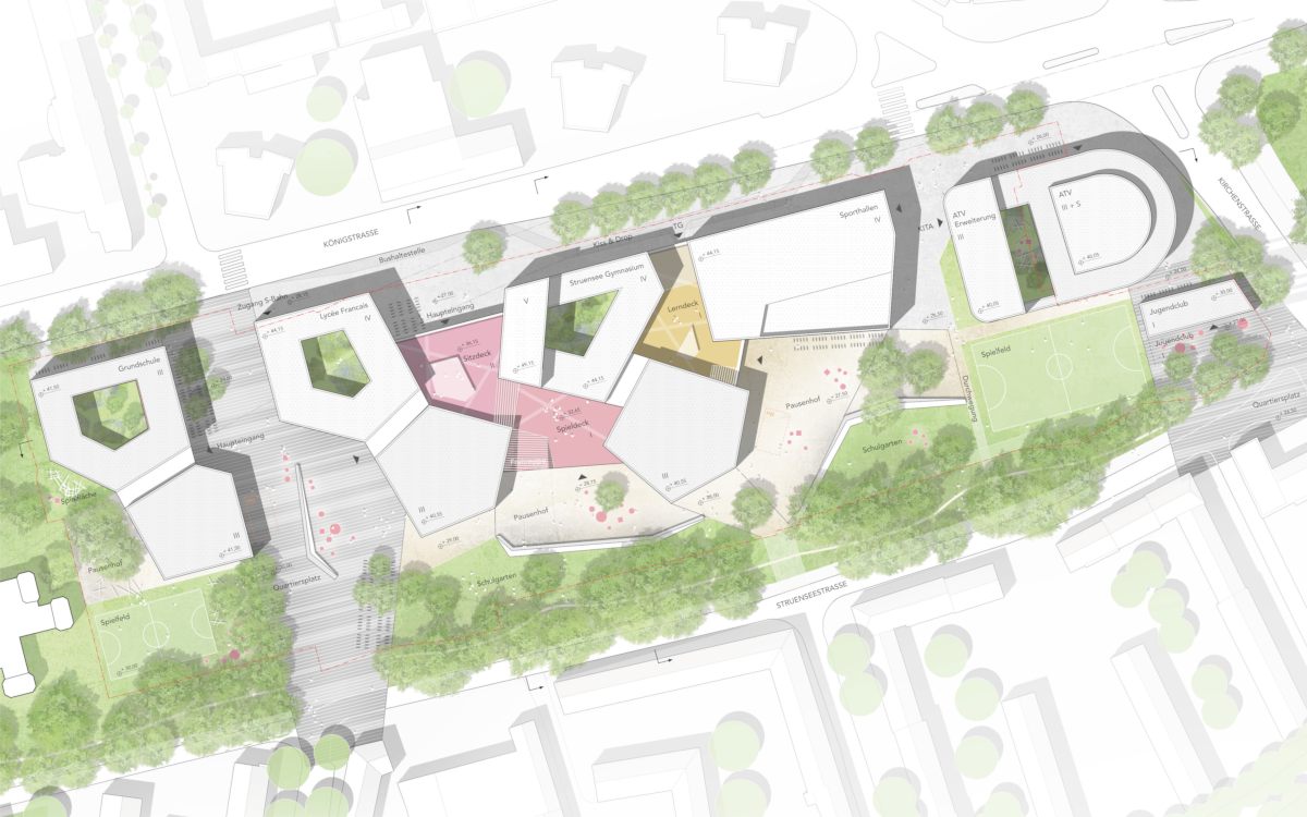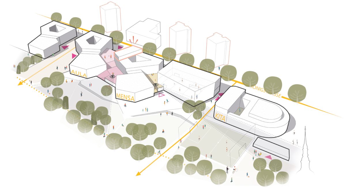 Dem Entwurf liegt eine klare städtebauliche Zonierung zu Grunde. An der Königstrasse werden straßenbegleitend und Straßenraum bildend Volumen gesetzt. Die Volumen bilden eine klare stadträumliche Kante, zeigen jedoch gezielt auch klar ablesbare Untereinheiten und generieren somit einen angemessenen Rhythmus. An der Struenseestraße dominiert der gestärkte Grünzug im Verbund mit den differenzierten Schulhöfen. Die Gebäudevolumen sind hier solitärhafter aufgelöst und ragen unterschiedlich tief in den Hofraum hinein. Es entsteht ein nördliches urbanes Band mit einer kompakten und gleichzeitig differenzierten Gebäudestruktur, welches ein generöses grünes Band für Schulhöfe und öffentliche Grünräume im Süden ermöglicht an dem auch quartiersbezogene, außerschulische Aktivitäten vorgesehen sind. Somit ist der Schulcampus mehr als nur ein Campus. Er ist eine wichtige Reparatur eines indifferenten urbanen Raumes.