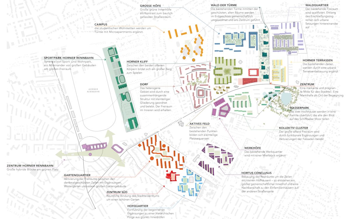 Die Qualitäten des Lebens in der Horner Geest werden gestärkt und weitergeschrieben – von Mono zu Multi: Wir identifizieren im Bestand minimal unterschiedliche Siedlungscluster und entwickeln diese zu charaktervollen Nachbarschaften. Dabei geht es darum, sowohl unterschiedlicher, als auch spezifischer als bisher zu sein.
