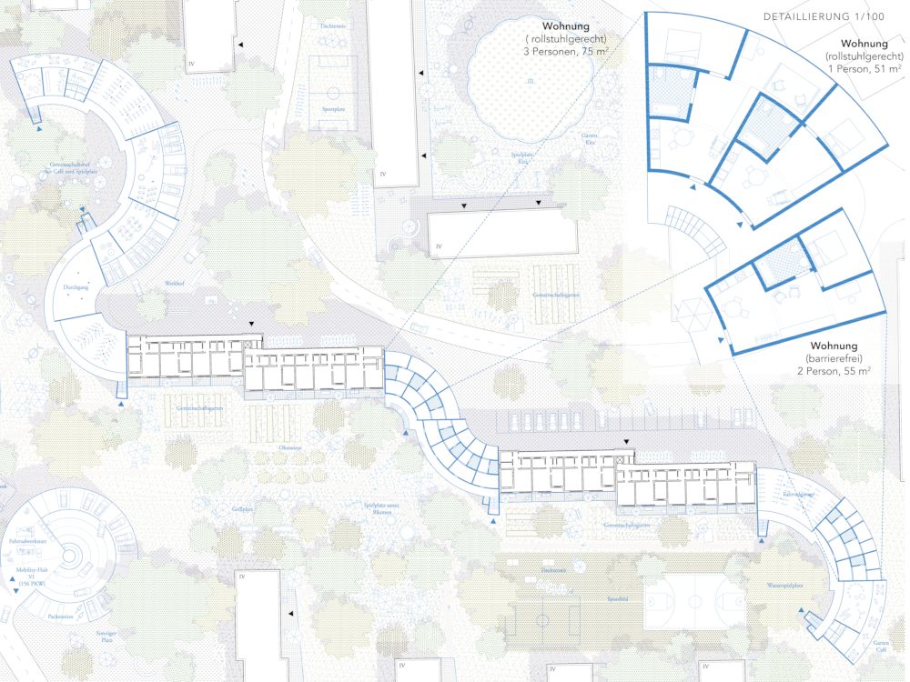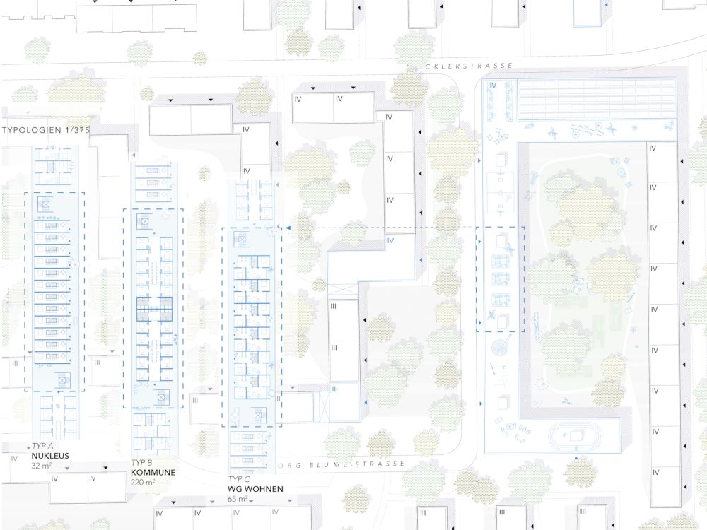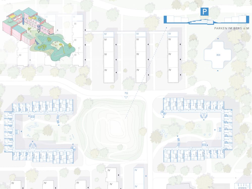Die grüne Prägung bleibt: Unterschiedliche Freiraumpotenziale werden aufgegriffen, gestärkt, mit den Nachbarschaften verzahnt und zu einem zusammenhängenden Raum – dem Grünen Loop – verbunden. Er ist voller Programm und stellt eine neue Hierarchie innerhalb des Stadtteils her, alle 19 Cluster liegen daran. Ein Fahrradweg verbindet alle öffentlichen Freiraumnutzungen miteinander.