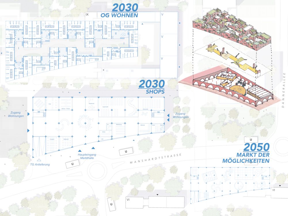 Die erzählerische Straße vernetzt das Quartier: Die Manshardtstraße wird zu einem Erlebnisraum zwischen grün und urban. Hier finden Austausch, Gewerbe und Handel statt. Auf der abwechslungsreichen Verbindung bilden sich drei Zentren, dazwischen zeigen sich die Nachbarschaften mit ihren unterschiedlichen Gesichtern zur Straße.