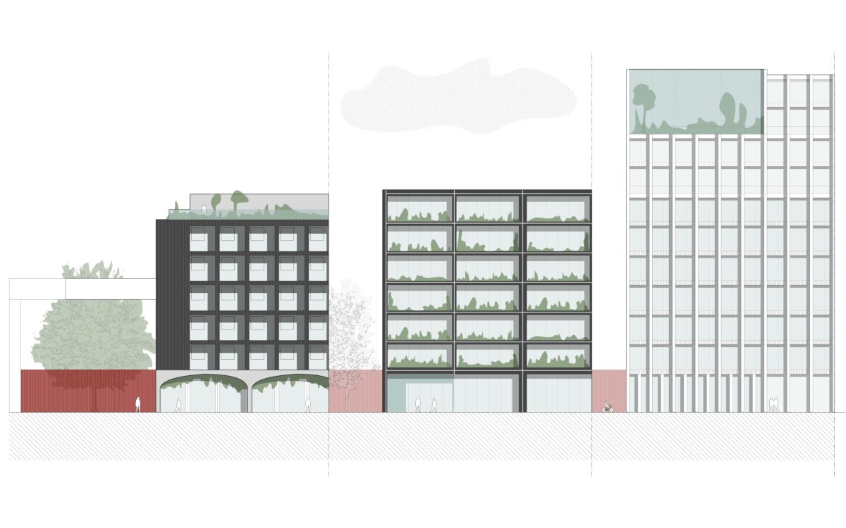 Fünf Typen aus dem gleichen Holz und doch ganz anders bilden sie die A.M.S. Hafengang. Sie sind strukturell und gestalterisch inspiriert durch das gewerbliche Hafenerbe, durch Schuppen und Türme, durch Container und Wellen. Sie sind metaphorisch nicht die nette Familie, eher die derbe Hafengang. Sie sind roh und geradeaus. Sie sind eigenwillig und haben Charakter. Sie sind typologisch sauber, ihnen liegt eine klare Idee zugrunde, die das ganze Haus determiniert. Sie gehorchen einem übergeordneten Regelwerk, das nachfolgende Aspekte jeder Gebäudeentwicklung zugrunde legt: Spezifische Typologie / Klare eigene repetitive Struktur und Konstruktion / Bild aus Struktur entwickelt / Nachhaltige, mindestens hybride, Konstruktion / Grünlayer hausspezifisch / gemeinsamer Materialkanon Städtebaulich folgen die gesetzten Volumina den beiden Infrastrukturen, mit weichen Versätzen, die Individualität der Häuser betonend. Der Charakter des Außenraumes soll übergeordnet ein wilder sein. Uns schwebt das Bild verlassener Bahngleise vor, zwischen denen sich Sträucher und Birken ihren Raum suchen. Der Werkhof ist dabei befestigt und für Arbeiten und Anlieferung vorgesehen. Der Platz an der Promenade ist sehr grün dominiert. Der Übergang zur Bille ist informell.