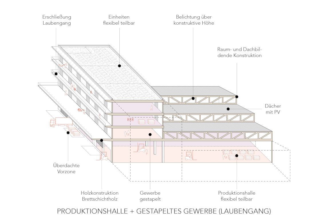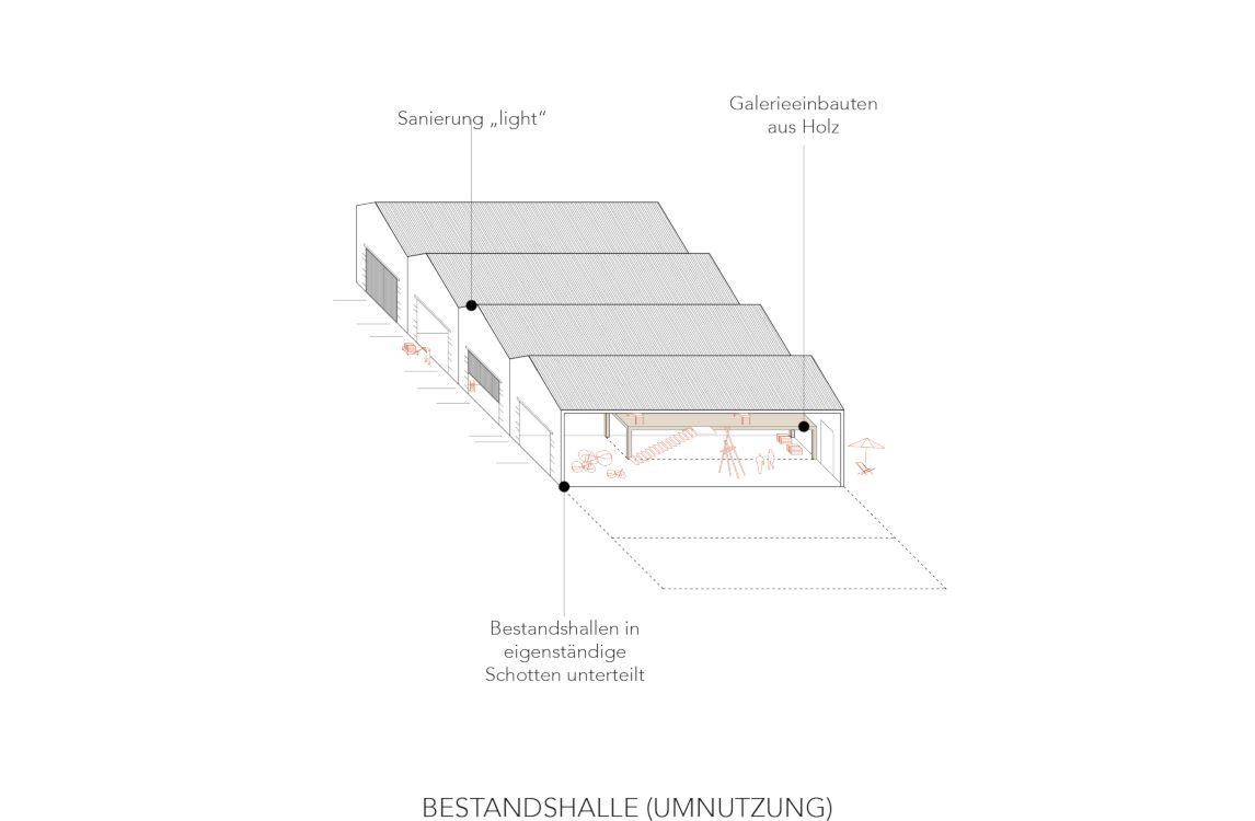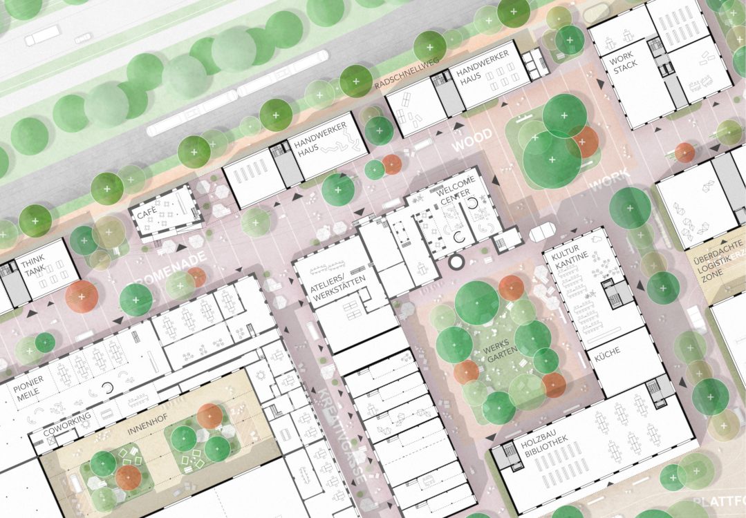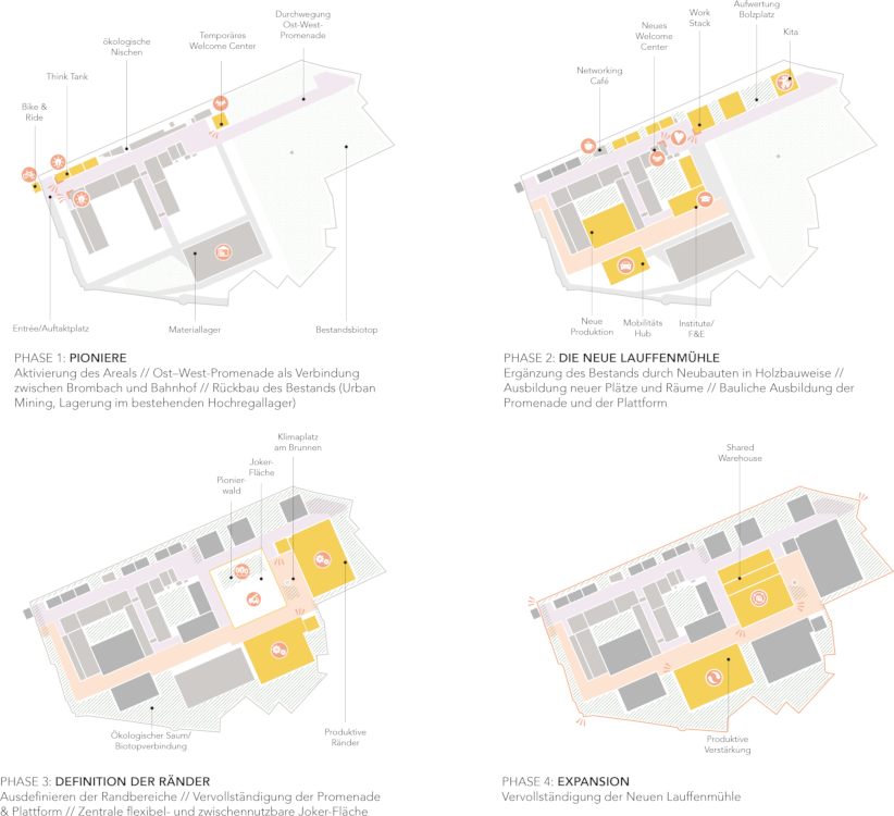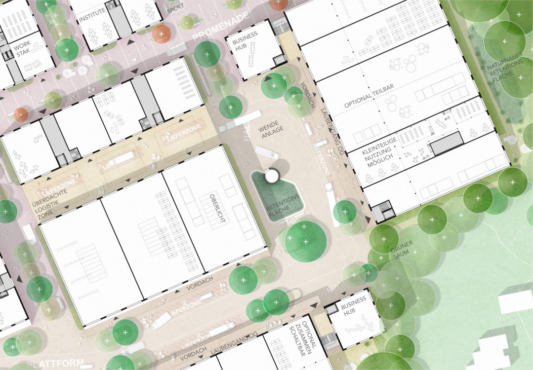 Unser Konzept „WoodWORK“ fußt auf den erhaltenswerten Bestandsstrukturen des Areals. Eine durch die kleinteilige Bestandsgebäude geprägte „Promenade“ im Norden des Areals bildet die Verbindung des angrenzenden Stadtteils Brombach zum unmittelbar gelegenen Bahnhof und fungiert als Aushängeschild des Areals. Die südliche „Plattform“ mit seinen großformatigen und dennoch klar gegliederten Hallen ist der Werkhof der neuen Lauffenmühle. Charakteristische Vordächer der gestapelten, gewerblichen Hallenköpfen in Holzbauweise prägen den Raum und die Adresse zu den flexibel und variabel nutzbaren Gewerbehallen.