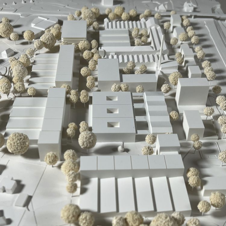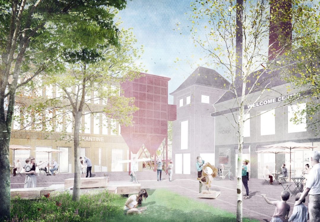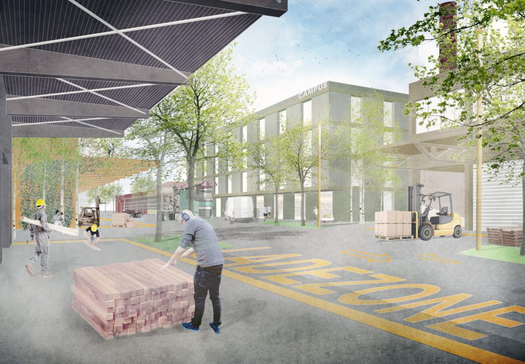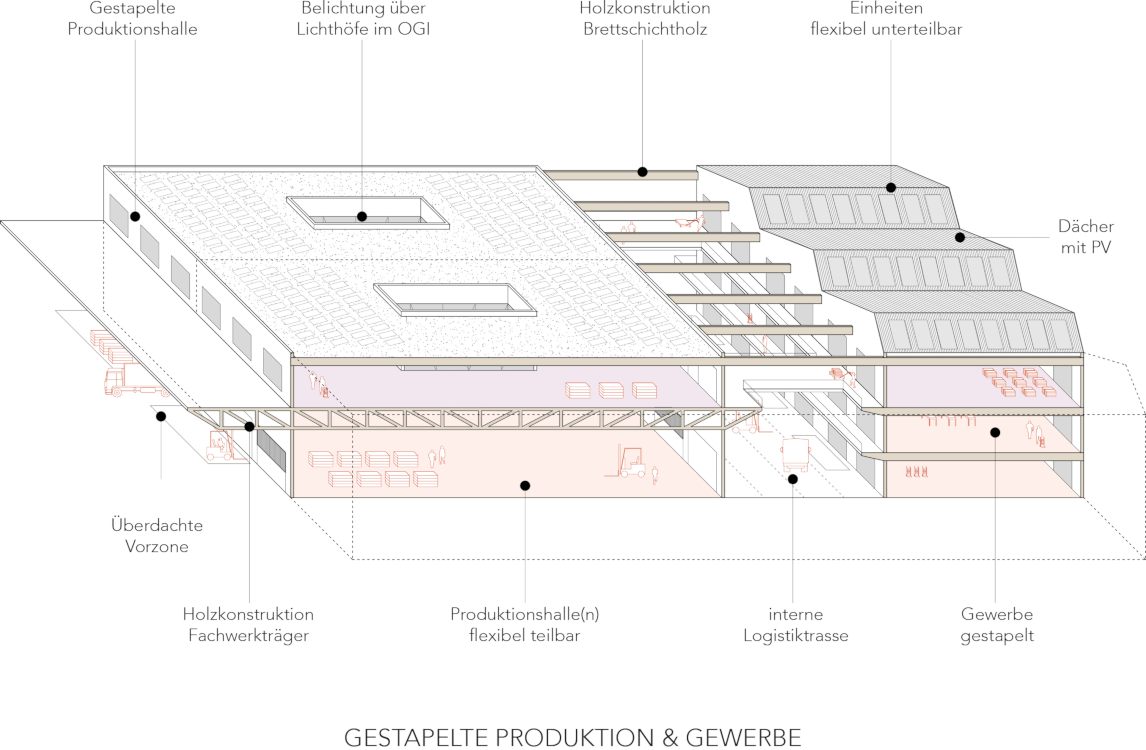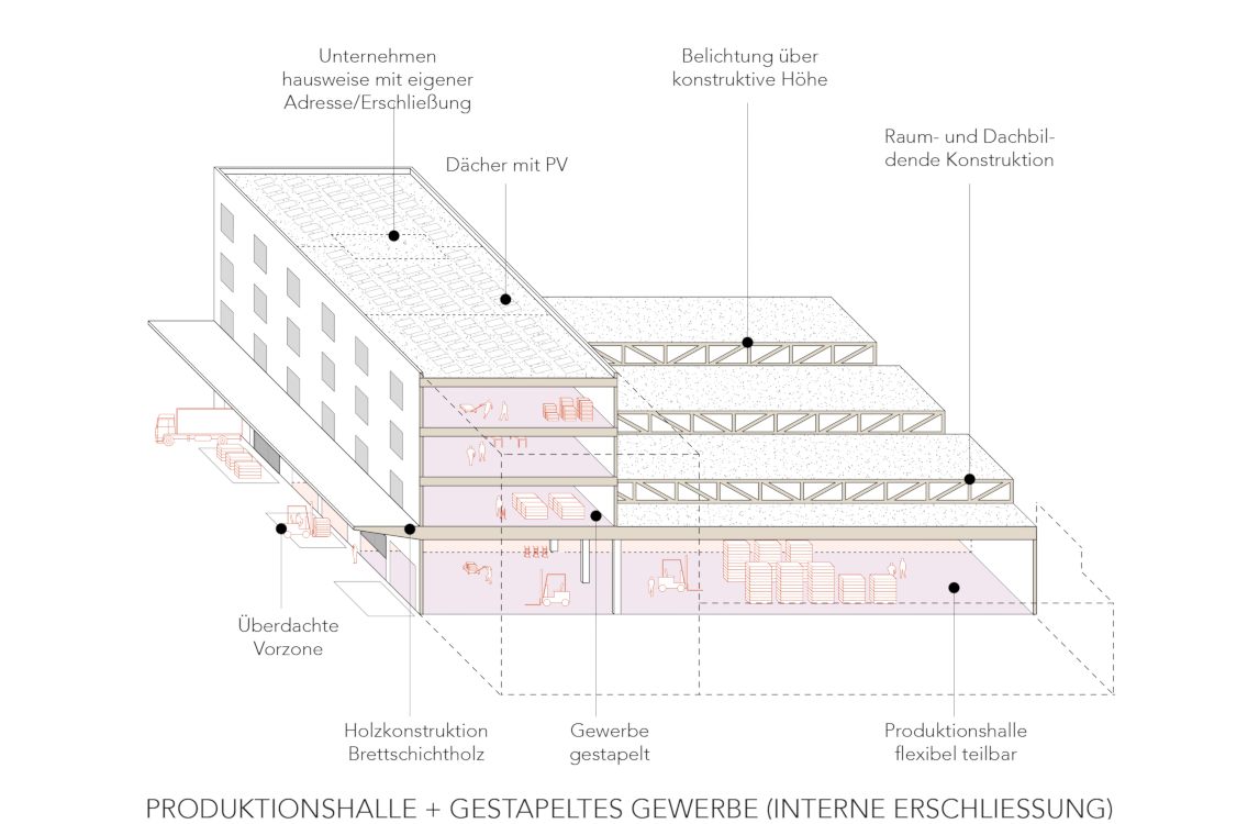 Unser Konzept „WoodWORK“ fußt auf den erhaltenswerten Bestandsstrukturen des Areals. Eine durch die kleinteilige Bestandsgebäude geprägte „Promenade“ im Norden des Areals bildet die Verbindung des angrenzenden Stadtteils Brombach zum unmittelbar gelegenen Bahnhof und fungiert als Aushängeschild des Areals. Die südliche „Plattform“ mit seinen großformatigen und dennoch klar gegliederten Hallen ist der Werkhof der neuen Lauffenmühle. Charakteristische Vordächer der gestapelten, gewerblichen Hallenköpfen in Holzbauweise prägen den Raum und die Adresse zu den flexibel und variabel nutzbaren Gewerbehallen.