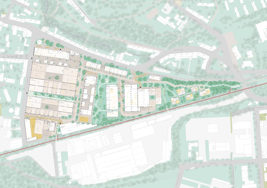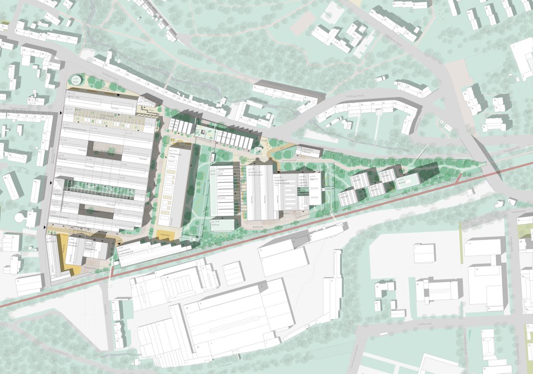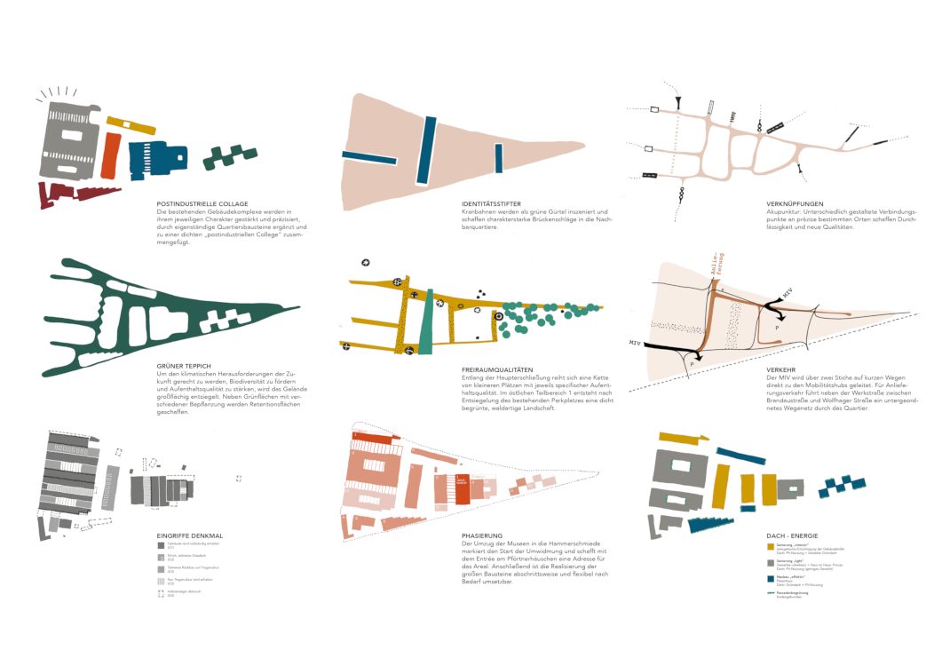 Beurteilungstext des Fachgremiums: Die Leitidee einer postindustriellen Collage, die aus der Gegenüberstellung von Alt und Neu, der Inszenierung der alten Kranbahntrassen und der Revitalisierung kleinerer Bauten wie des Turbinenhauses lebt, wird positiv gewürdigt. Insgesamt wurden sechs Bausteine definiert: Kesselschmiede, Quartiershalle, Hammerschiede, Turbinenhöfe, die ‚Lok‘ und das Wohnen im Kesselpark. (...) Die ‚Lok‘ schafft eine klare Grenze mit einer dahinter geschützten Freiraumsituation, die Museen an ihrem neuen Ort hingegen öffnen sich dadurch umso mehr nach außen. Im Kern wird eine aktive Freiraumnutzung und eine Interaktion von Freiraum und Gebäude durch die angebotenen Gebäudedurchquerungen und Erdgeschoss-nutzungen unterstützt. Die Freiraumstruktur in der Nord-Süd-Durchquerung ist klar und überzeugend.